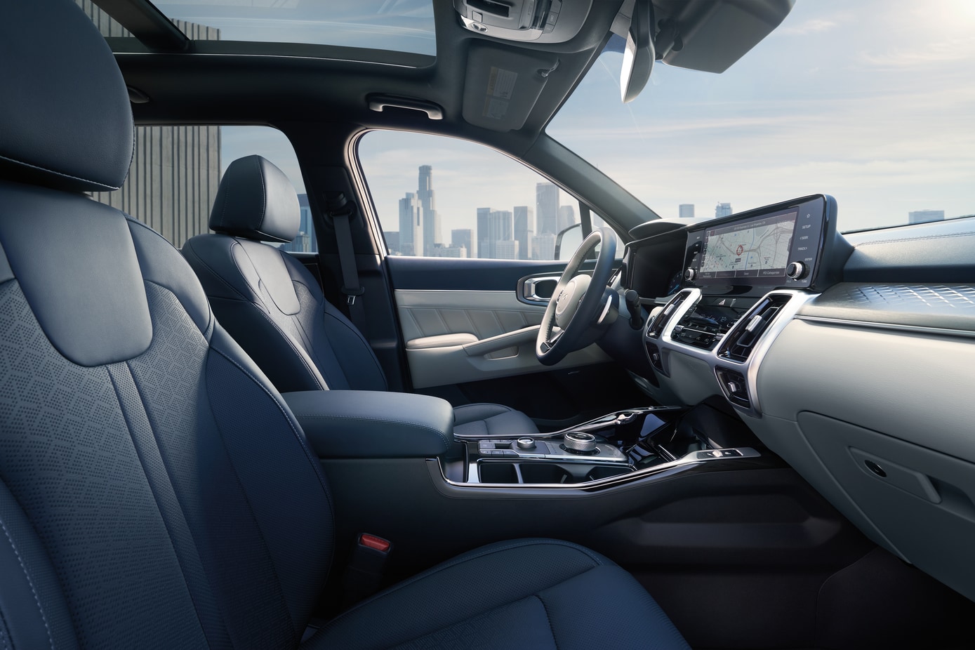 Inside the cabin, the new Sorento Hybrid provides a comfortable and refined environment. Synthetic leather upholstery comes standard, with genuine leather available on the SX Prestige. Heated front seats, a ten-way power driver's seat, and one-touch folding second-row seats are just a few of the convenience features you'll find. The Sorento Hybrid is also a smart pick for Concord families, with over 75 cubic feet of maximum cargo space when you fold the second and third rows.