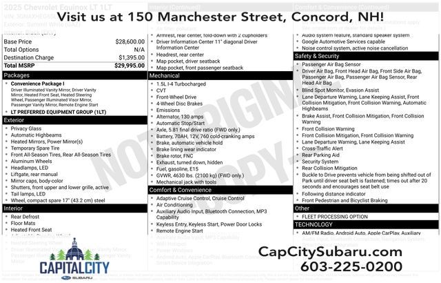 Beneath the hood, the Equinox LT boasts a 1.5L DOHC engine paired with a smooth-shifting CVT transmission, delivering an impressive fuel efficiency of 26 city / 28 highway MPG. This powertrain provides a perfect balance of power and efficiency, ensuring a responsive and enjoyable driving experience.