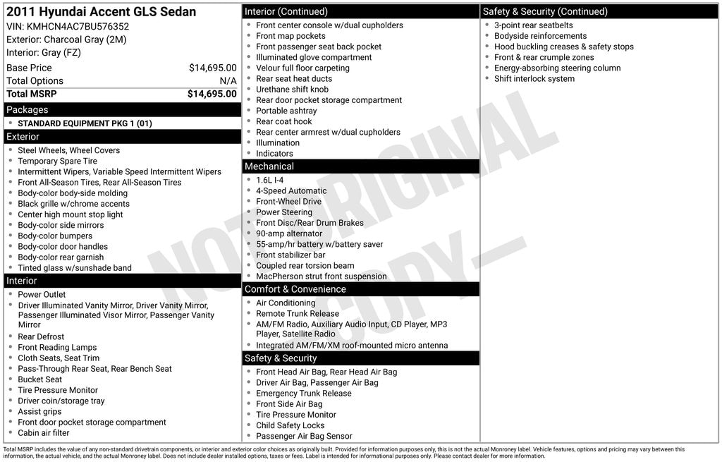 And here's the kicker: you get all this without breaking the bank. With Hyundaiâs reputation for reliability and low maintenance costs, the 2011 Accent GLS is the budget-friendly ride that doesnât feel like a compromise.