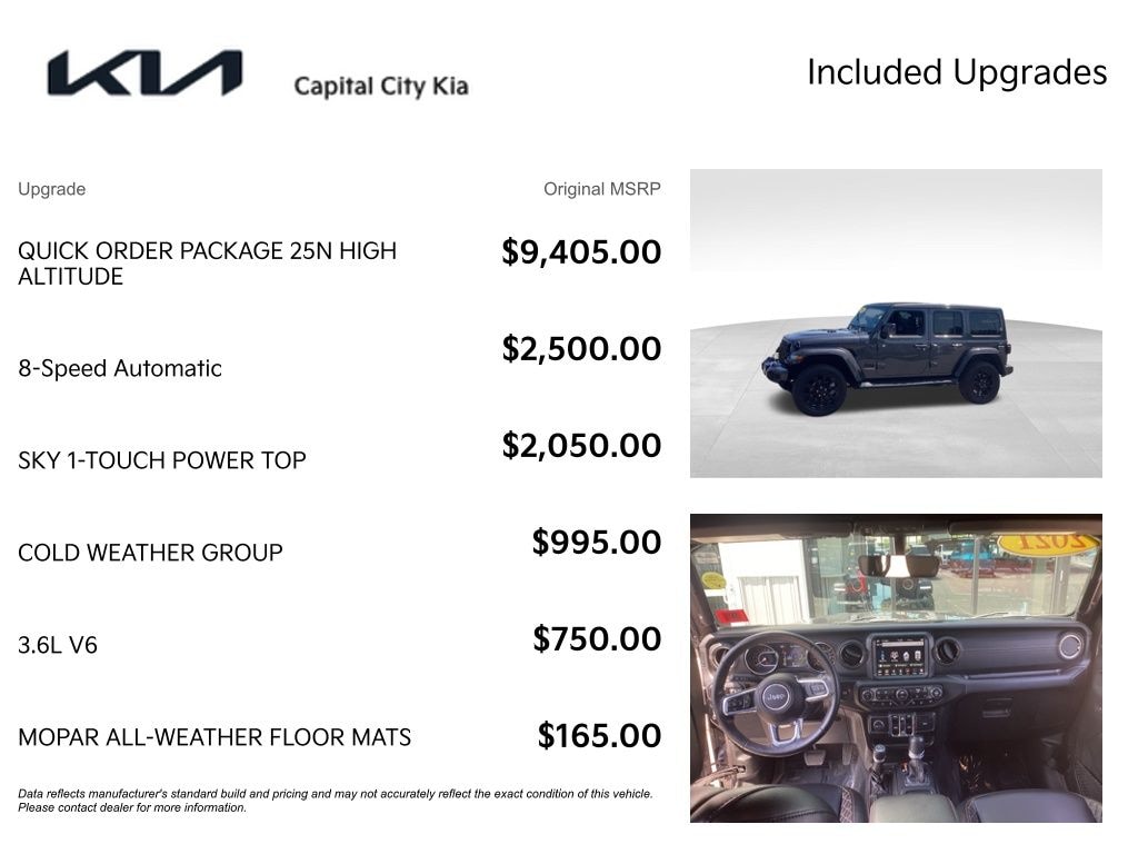 We invite you to visit our showroom and experience the remarkable 2021 Jeep Wrangler Unlimited Sahara High Altitude for yourself. Let our knowledgeable team demonstrate how this exceptional vehicle can fulfill your adventurous spirit and elevate your everyday driving. We're confident that once you get behind the wheel, you'll be captivated by its unparalleled capabilities and refined sophistication. Schedule a test drive today and discover the true meaning of freedom and exploration.