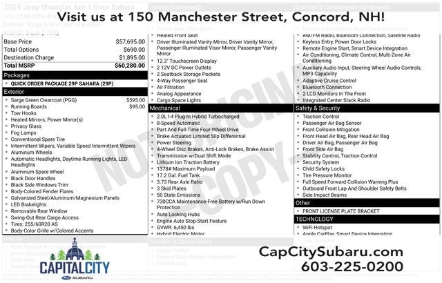 Experience the thrill of the open road and the untamed wilderness with the 2024 Jeep Wrangler Sahara 4xe. Visit us at 150 Manchester St Concord NH, 03301 or call us at (603)225-0200 to schedule a test drive. Family owned & operated. Purchases include lifetime New Hampshire State Inspections. Use of complimentary service loaner fleet.