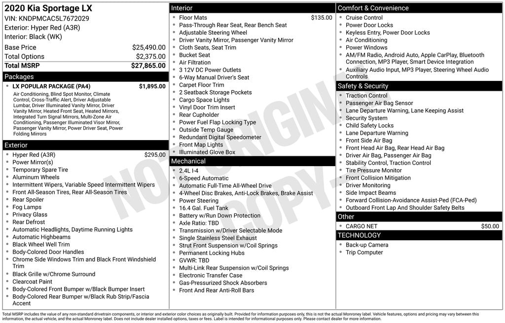 The 2020 Kia Sportage LX delivers the perfect balance of style, comfort, and practicality. With its sporty design, smooth handling, and fuel-efficient performance, this compact SUV makes every drive enjoyable. Inside, youâll find a thoughtfully designed cabin with advanced technology like smartphone integration and driver-assist features that keep you connected and safe. Reliable, affordable, and fun to drive, the Sportage LX is built to handle daily commutes and weekend adventures with equal ease.