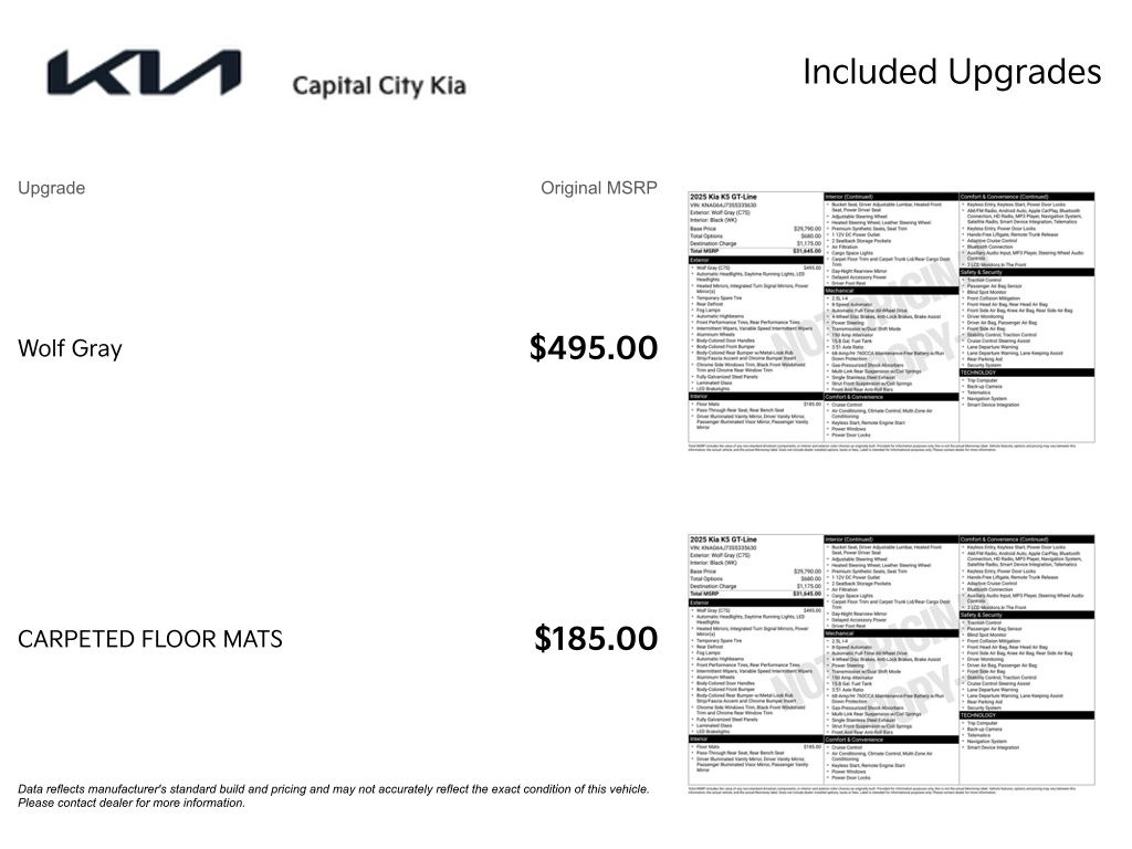 The K5 GT-Line is packed with a wealth of premium amenities to elevate your daily commute and weekend adventures. Enjoy the convenience of keyless entry, the comfort of heated front seats, and the advanced technology of the navigation system. Stay connected with the AM/FM audio system and SiriusXM radio, while the Kia Connect emergency communication system provides added peace of mind.