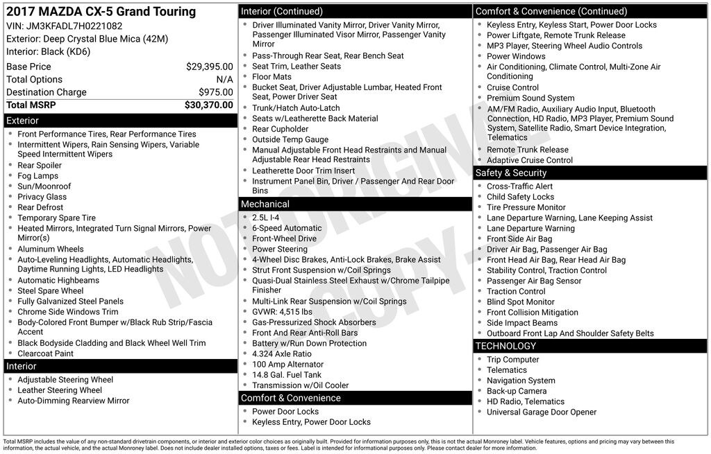 The 2017 Mazda CX-5 Grand Touring is where elegance meets adrenaline. From the moment you press the start button, its spirited 2.5-liter SKYACTIV-G engine hums to life, ready to turn every drive into an experience. The sculpted KODO design flows seamlessly from the bold front grille to its athletic stance, making it look in motion even when parked. Slip inside, and youâre greeted by luxurious leather-trimmed seats, a power moonroof, and a driver-focused cockpit that blends sophistication with pure functionality.