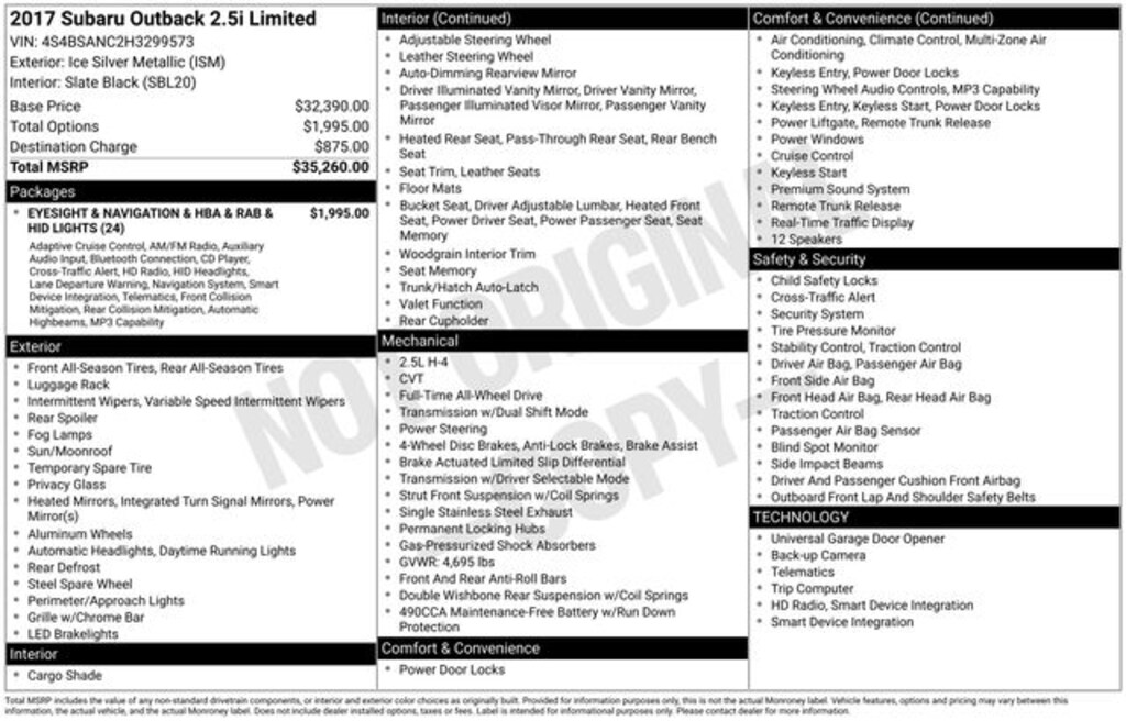 Ensuring composure no matter the driving circumstances! Subaru infused the interior with top shelf amenities, such as: a rear window wiper, heated front and rear seats, and a blind spot monitoring system. Smooth gearshifts are achieved thanks to the 2.5 liter 4 cylinder engine, and for added security, dynamic Stability Control supplements the drivetrain. All wheel drive provides for safe passage, regardless of road or weather conditions.