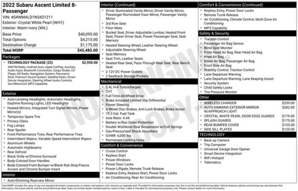 This 2022 Subaru Ascent Limited is the perfect blend of style, technology, and capability. Experience the difference for yourself by scheduling a test drive today. We're confident you'll be impressed by this exceptional SUV.