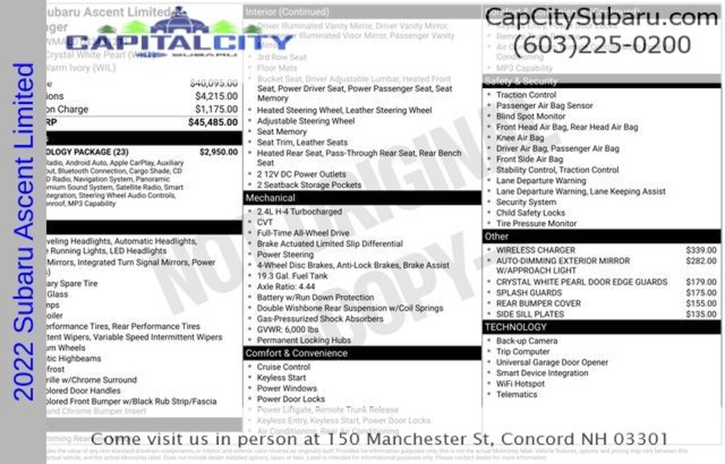Elevate your driving experience with this stunning 2022 Subaru Ascent Limited. This versatile SUV boasts a captivating exterior in a sleek White color, complemented by a wealth of premium features that will enhance your daily commute and weekend adventures.