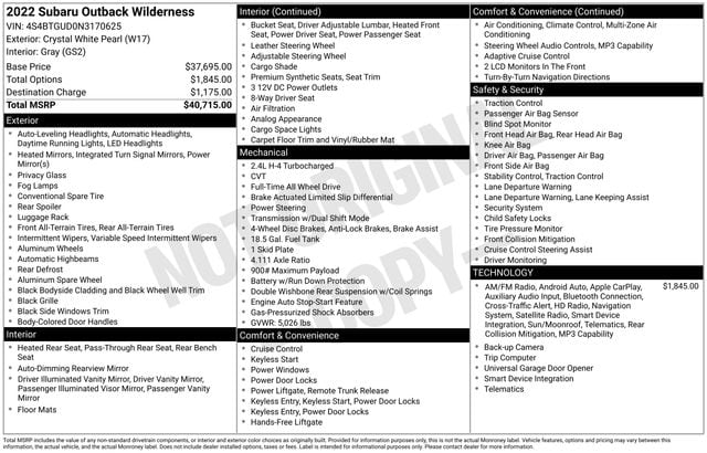Beyond its impressive mechanical prowess, the Outback Wilderness pampers its occupants with a wealth of premium amenities. Enjoy the convenience of a power liftgate, the comfort of heated front and rear seats, and the advanced technology of the Subaru STARLINK infotainment system with navigation, Apple CarPlay, and Android Auto.
