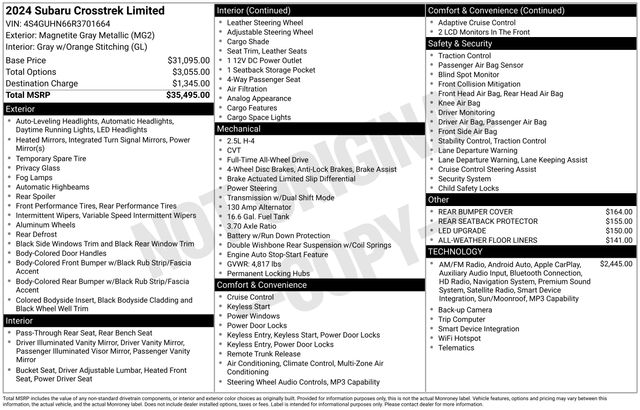 Comfort and convenience are paramount in the Crosstrek Limited. Heated front seats, dual-zone automatic climate control, and a power driver's seat ensure a personalized and relaxing driving environment. The rear seatback protector and all-weather floor liners provide added protection and versatility, making this Crosstrek the perfect companion for your active lifestyle.