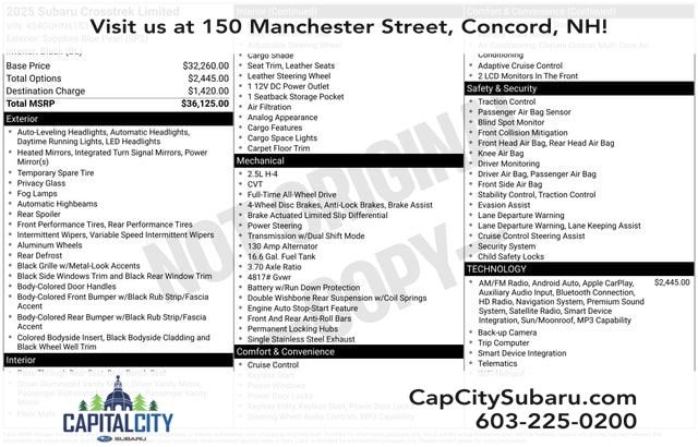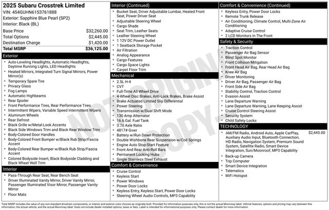 A wealth of standard features means that you no longer have to sacrifice! With fewer than a thousand miles on the odometer, this 4 door sport utility vehicle prioritizes comfort, safety and convenience. Subaru prioritized practicality, efficiency, and style by including: an outside temperature display, power door mirrors, and 1-touch window functionality. Under the hood you'll find a 4 cylinder engine with more than 170 horsepower, and for added security, dynamic Stability Control supplements the drivetrain.